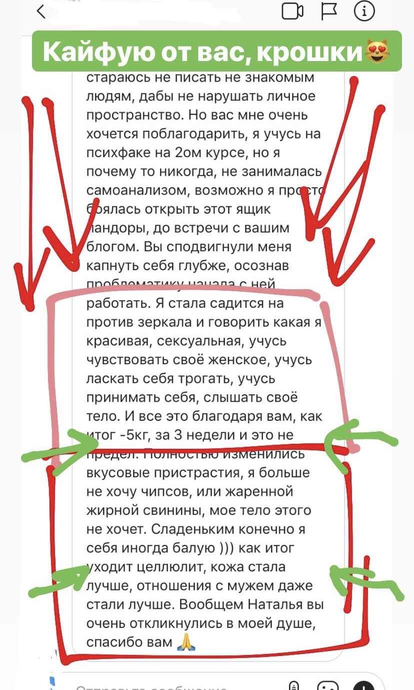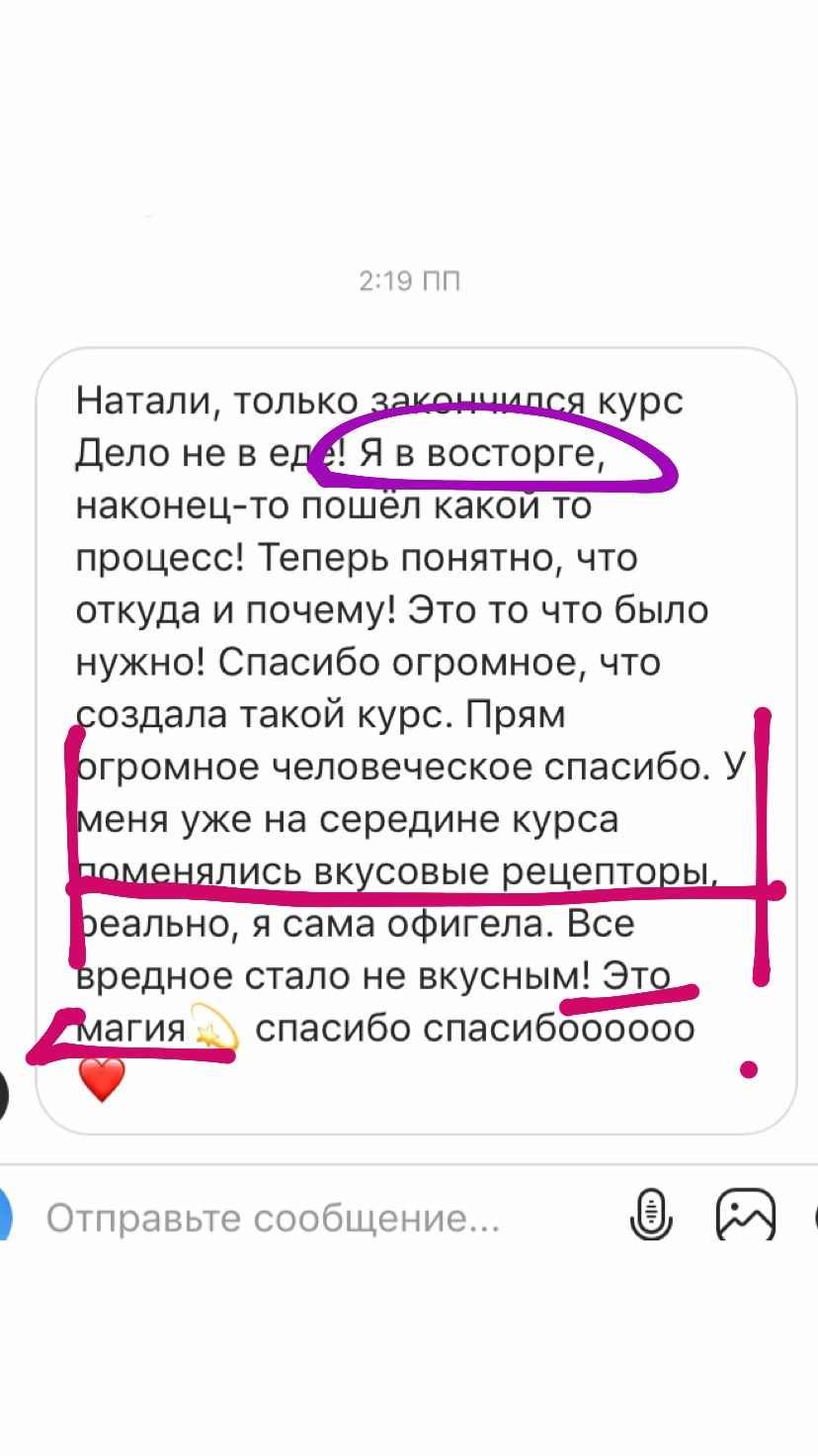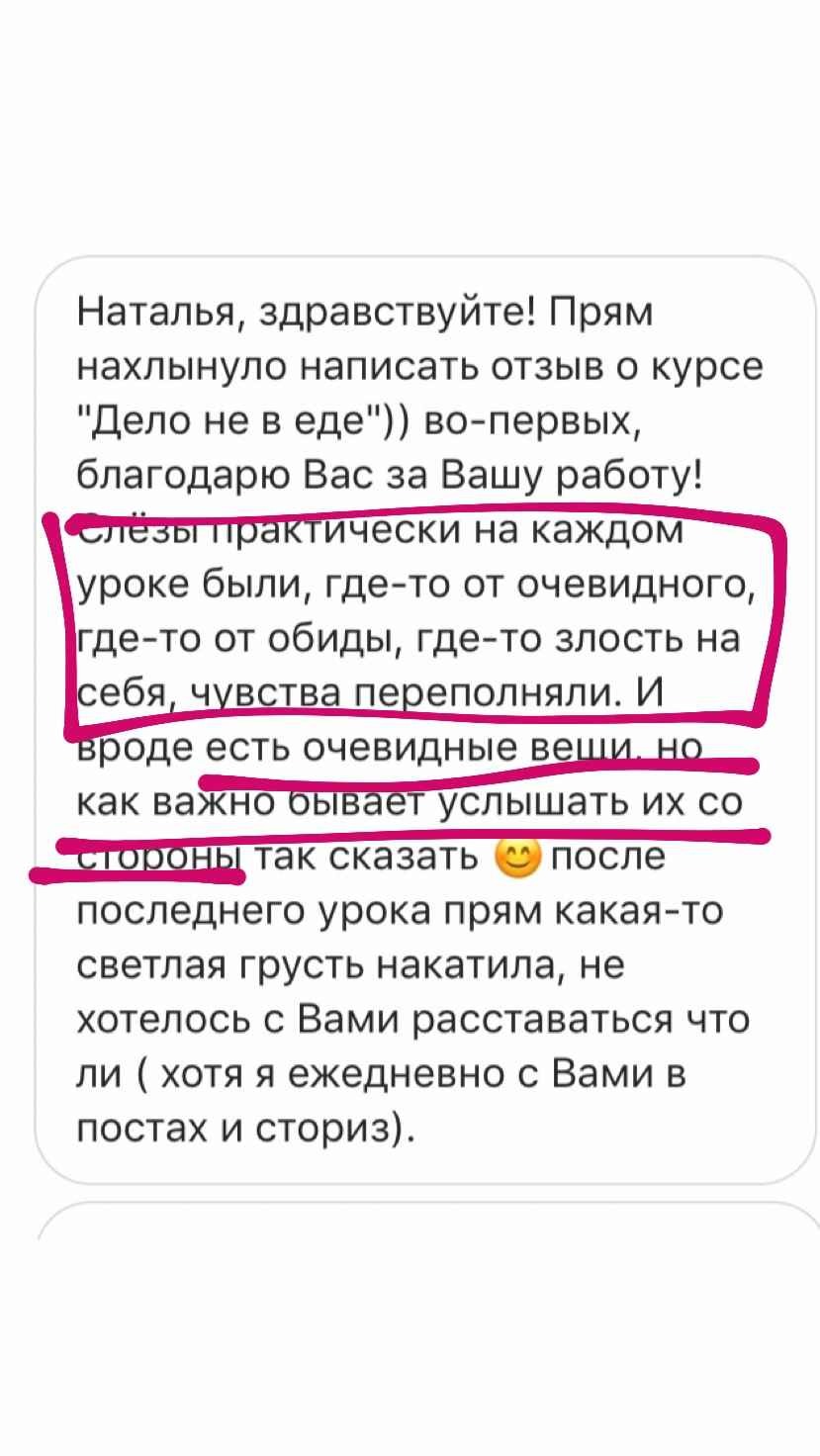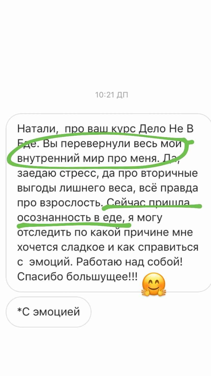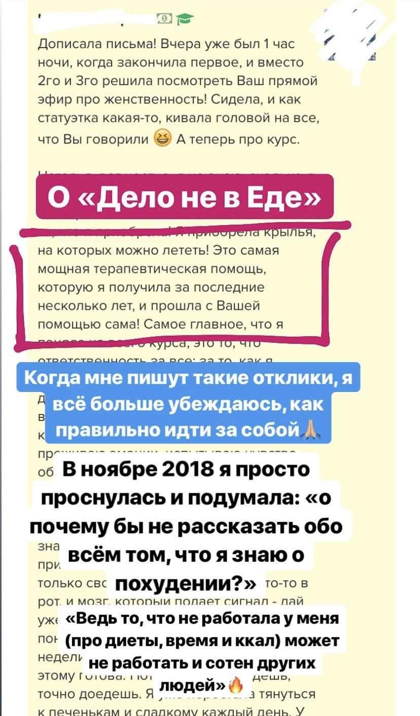 При этом я не вываливаю на Вас тонну информации, которой обладаю. «Дело не в еде» — это не куча теории и упражнений, собранных по принципу «чем больше, тем лучше или что-нибудь да точно сработает». Это оптимально построенный курс, который позволит перейти Вам из точки А в желаемую точку Б.