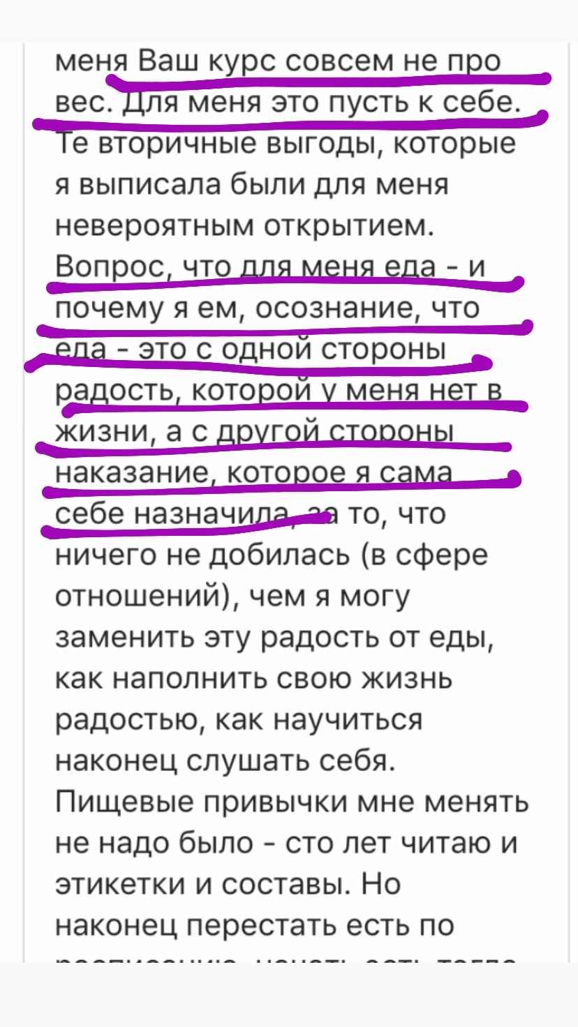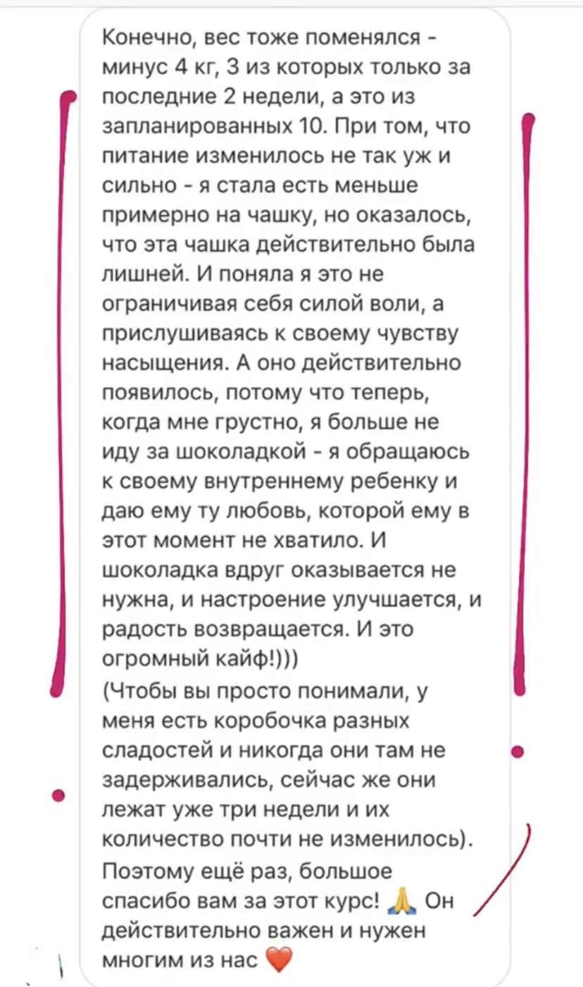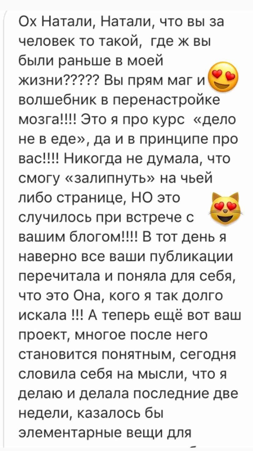 В свое время я столкнулась с той же проблемой и не смогла найти курс, который бы доказал свою эффективность. Путем долгих проб и ошибок, в течение 8 лет я собирала по крупицам информацию, борясь с лишним весом на собственном опыте. Я гарантирую Вам, что та система, которую мы разработали в курсе работает. Это доказано мной и сотнями участников, посмотрите отзывы – они главная гарантия