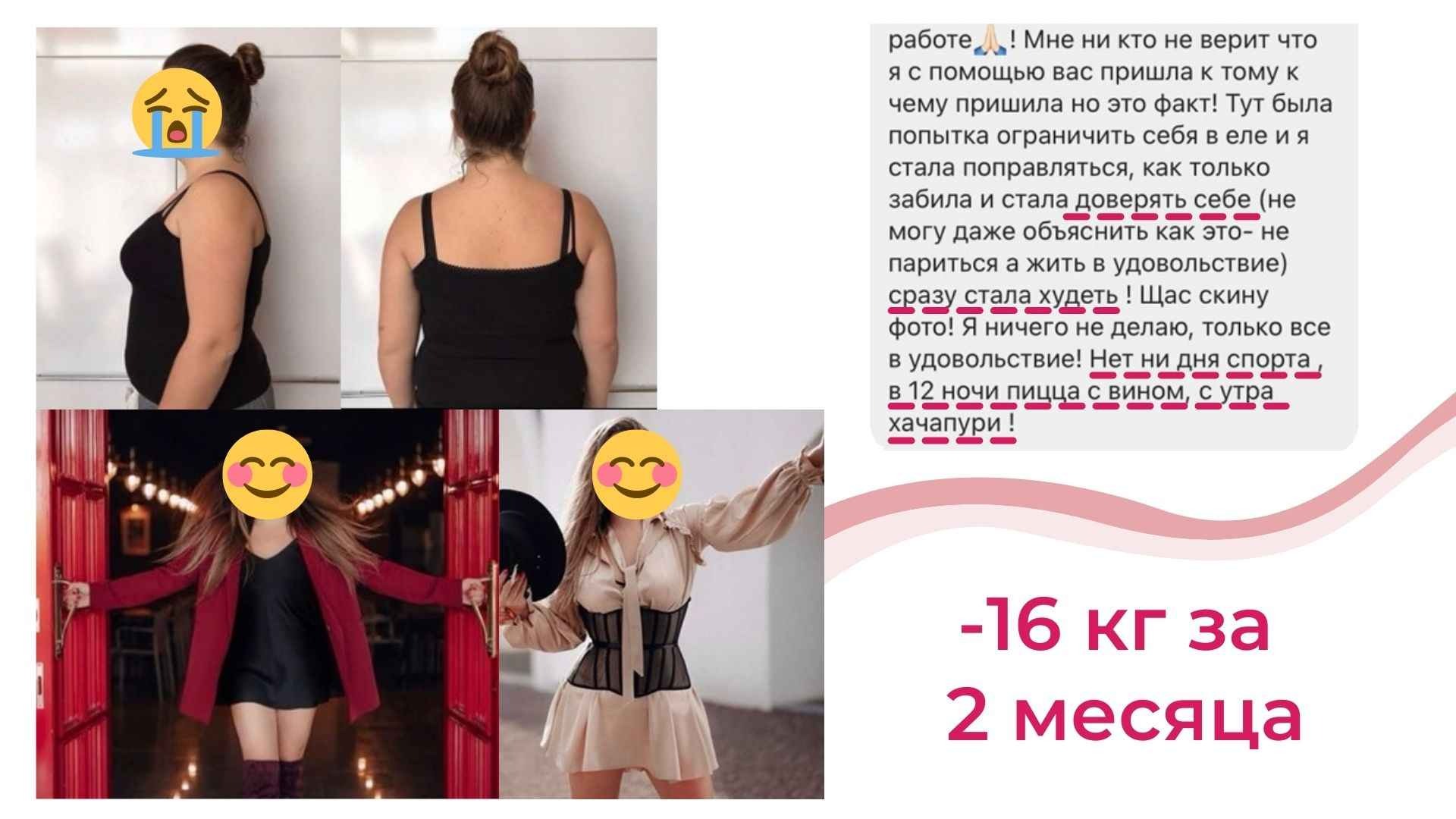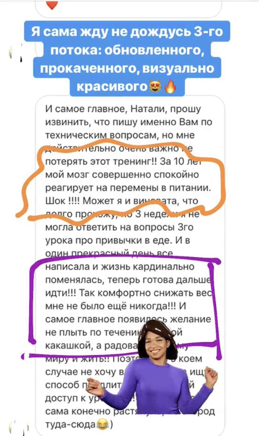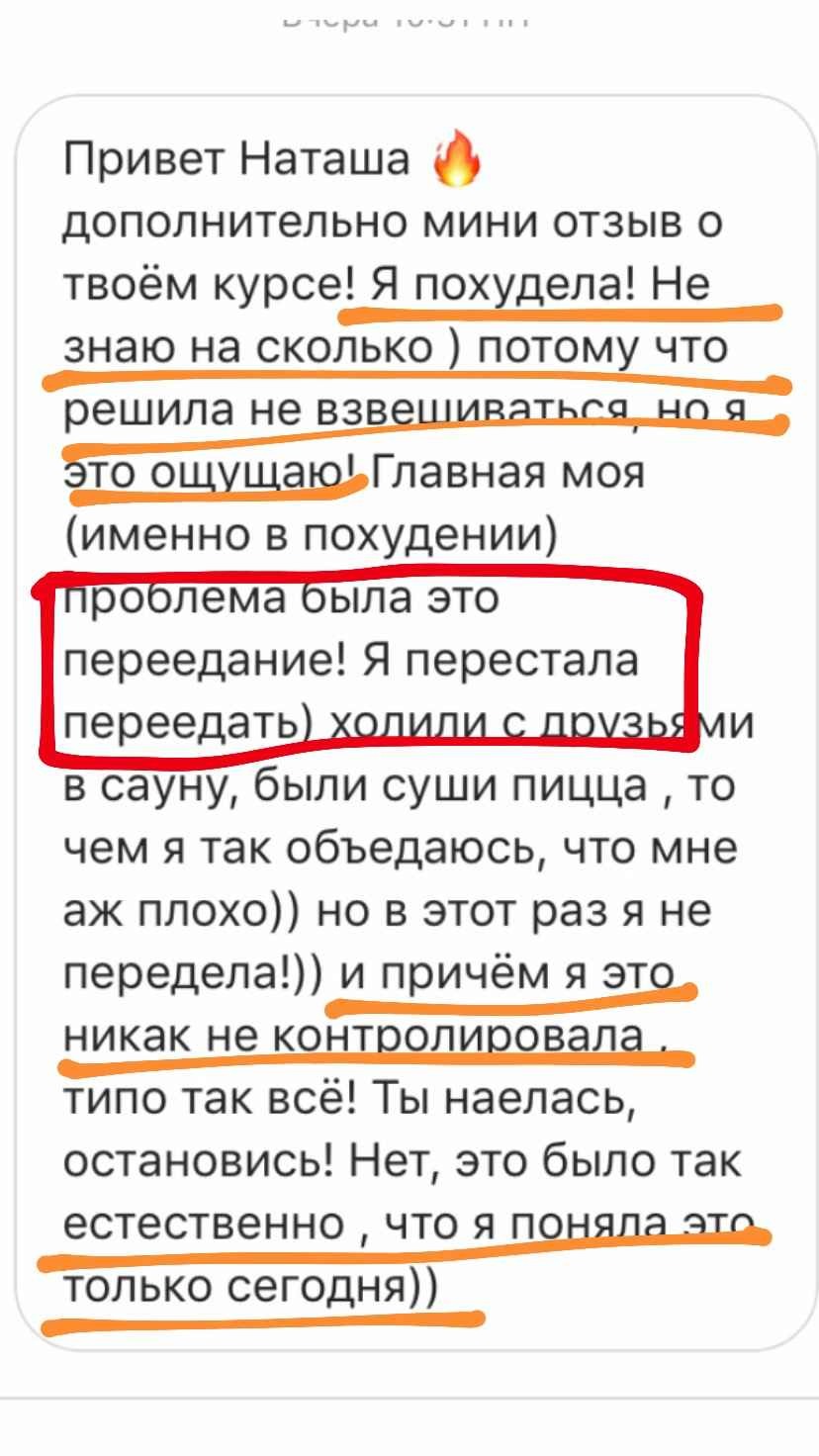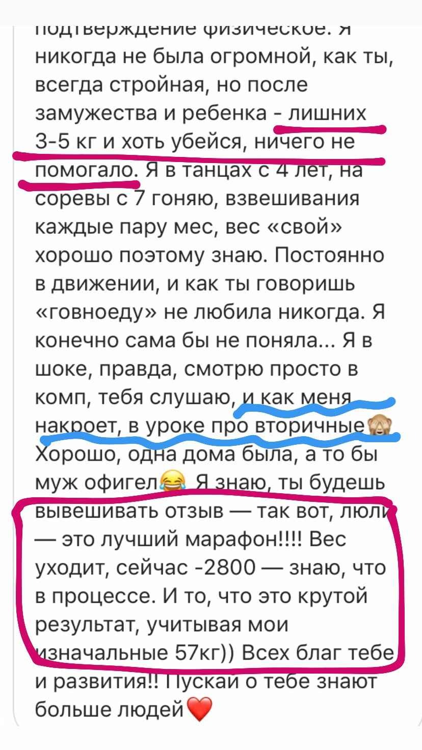 В свое время я столкнулась с той же проблемой и не смогла найти курс, который бы доказал свою эффективность. Путем долгих проб и ошибок, в течение 8 лет я собирала по крупицам информацию, борясь с лишним весом на собственном опыте. Я гарантирую Вам, что та система, которую мы разработали в курсе работает. Это доказано мной и сотнями участников, посмотрите отзывы – они главная гарантия