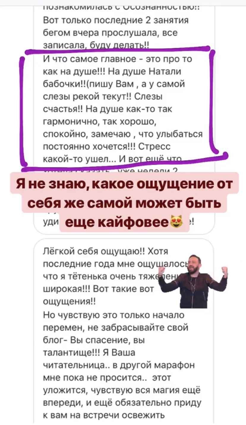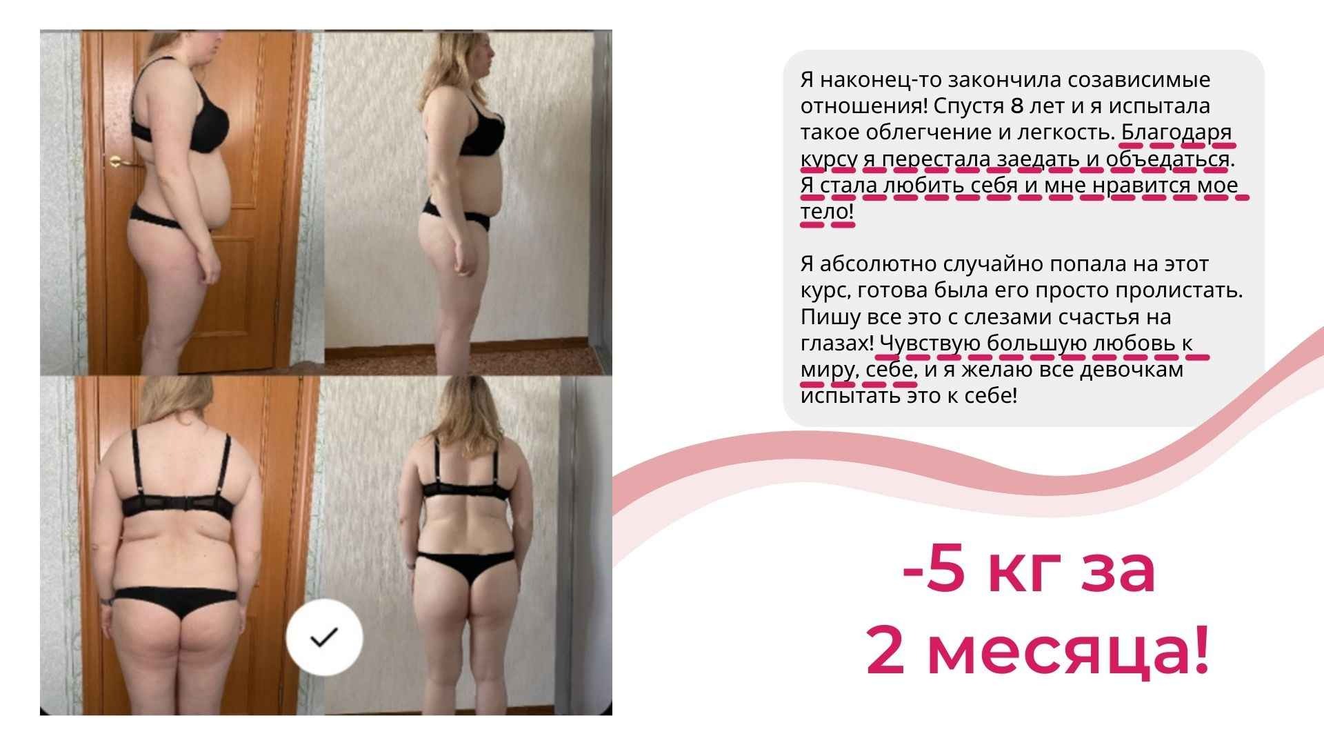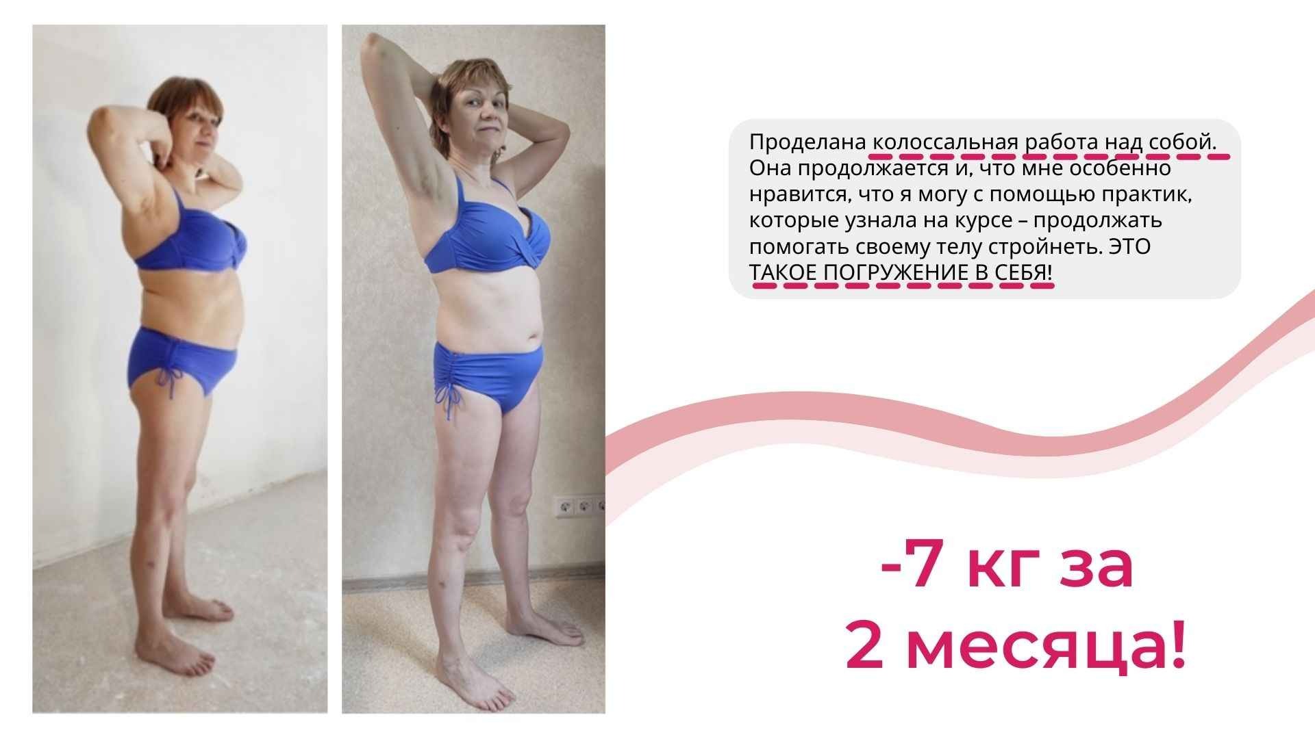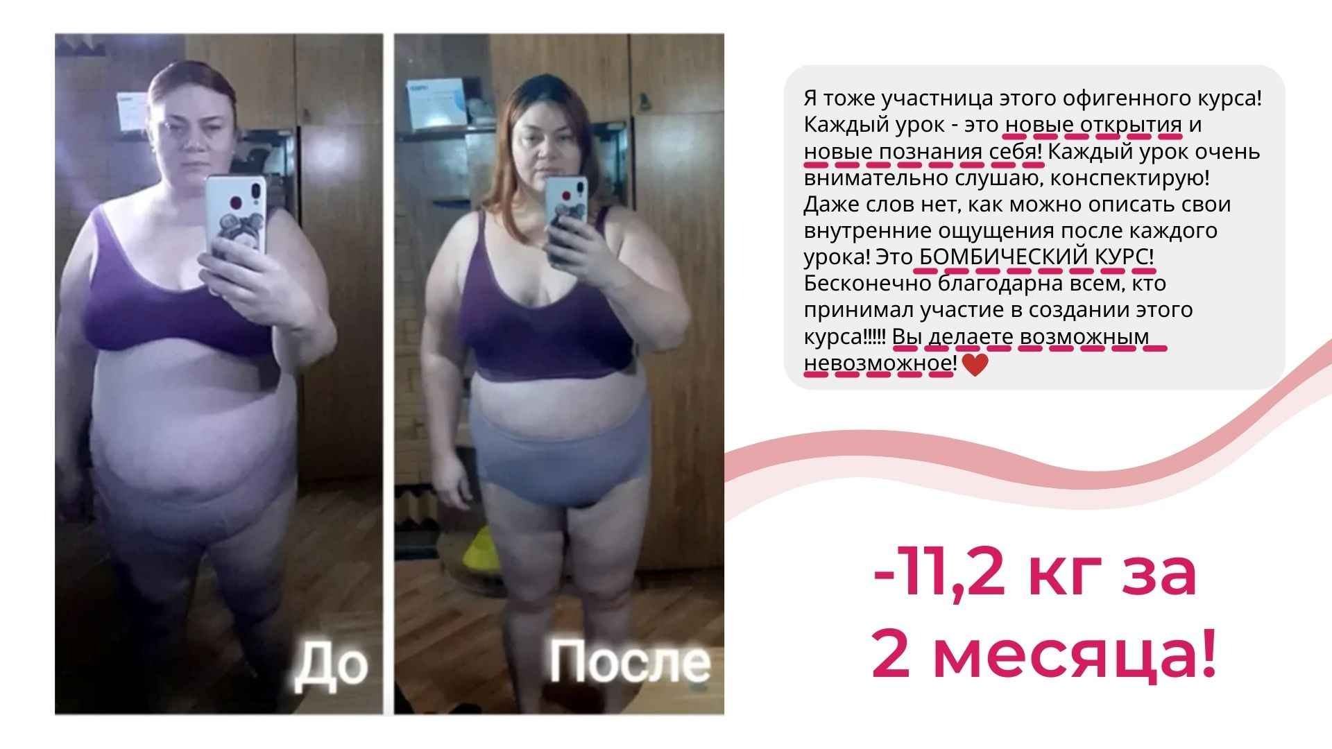 Это курс не про «повтори мой успех, смотри на меня и делай как я», а про Ваш собственный индивидуальный путь к своему новому телу.
