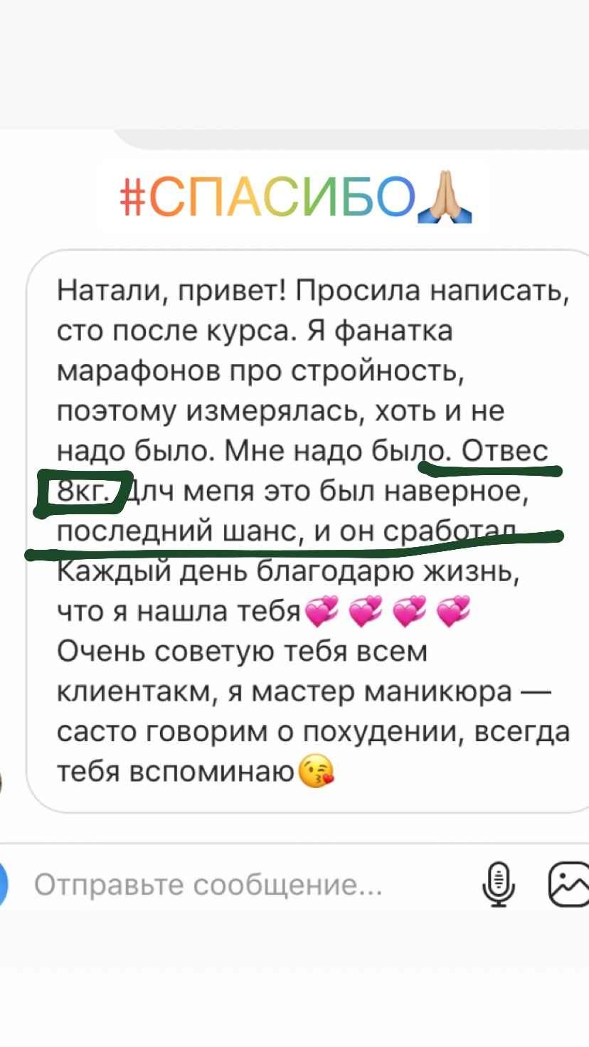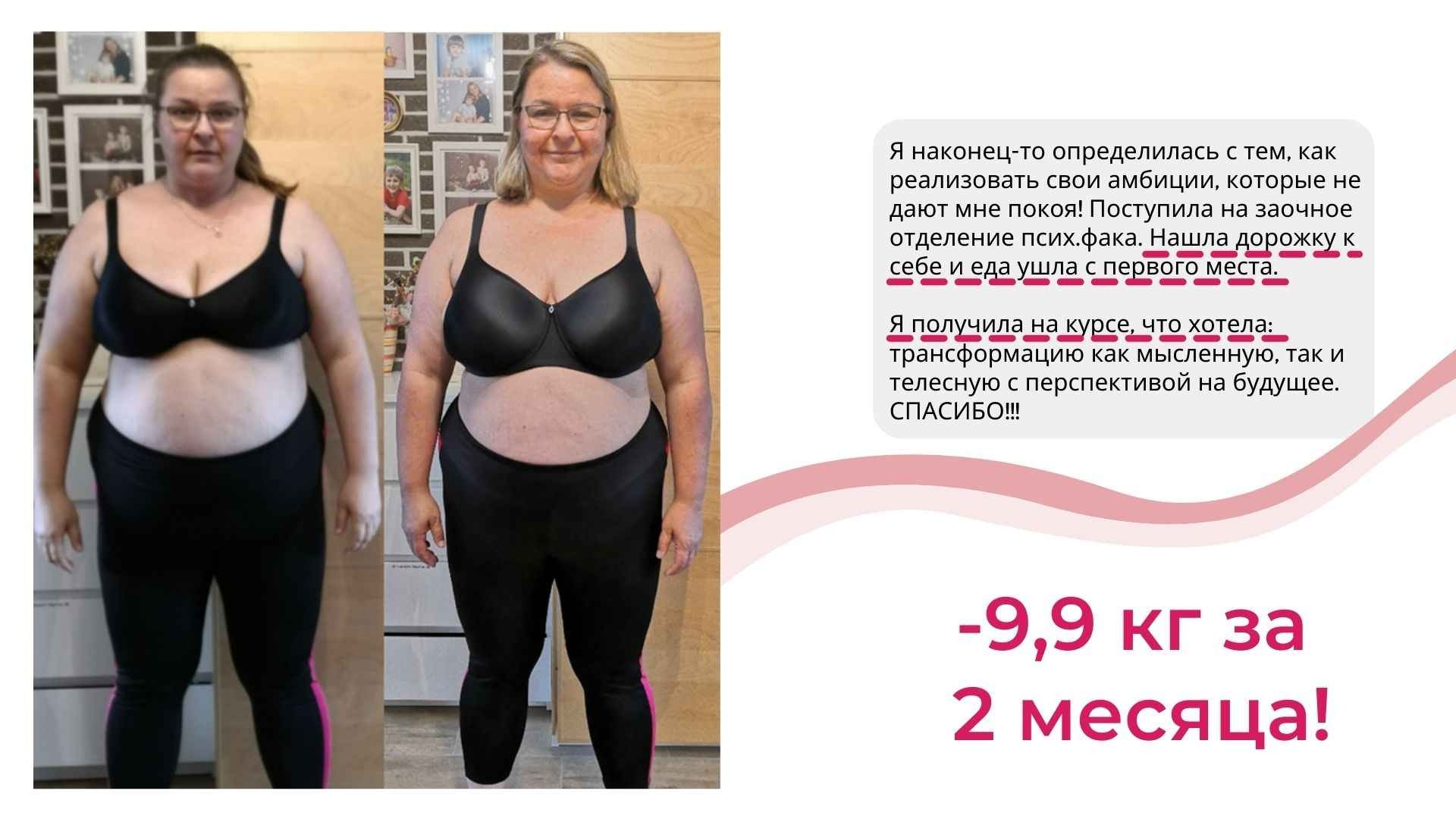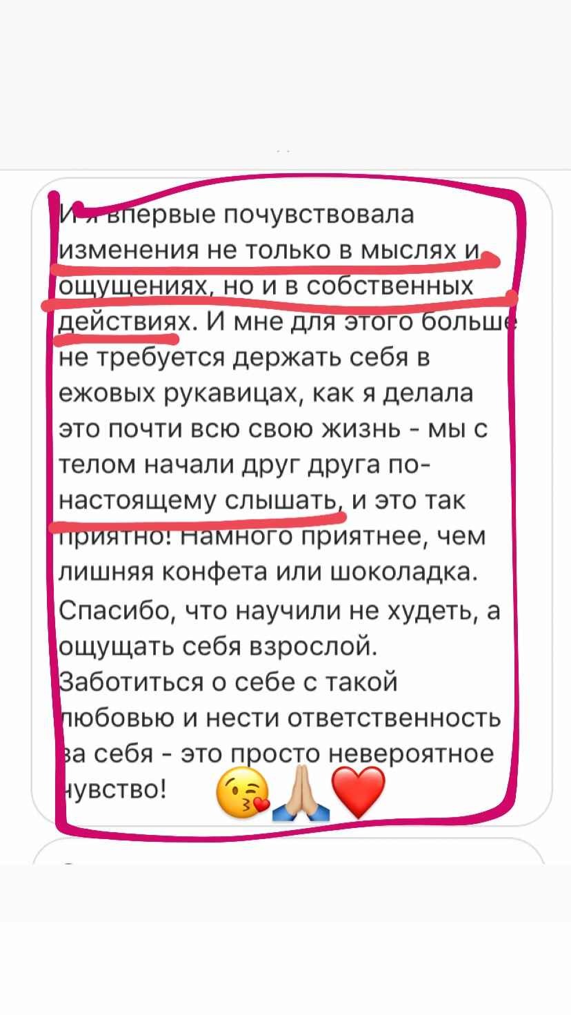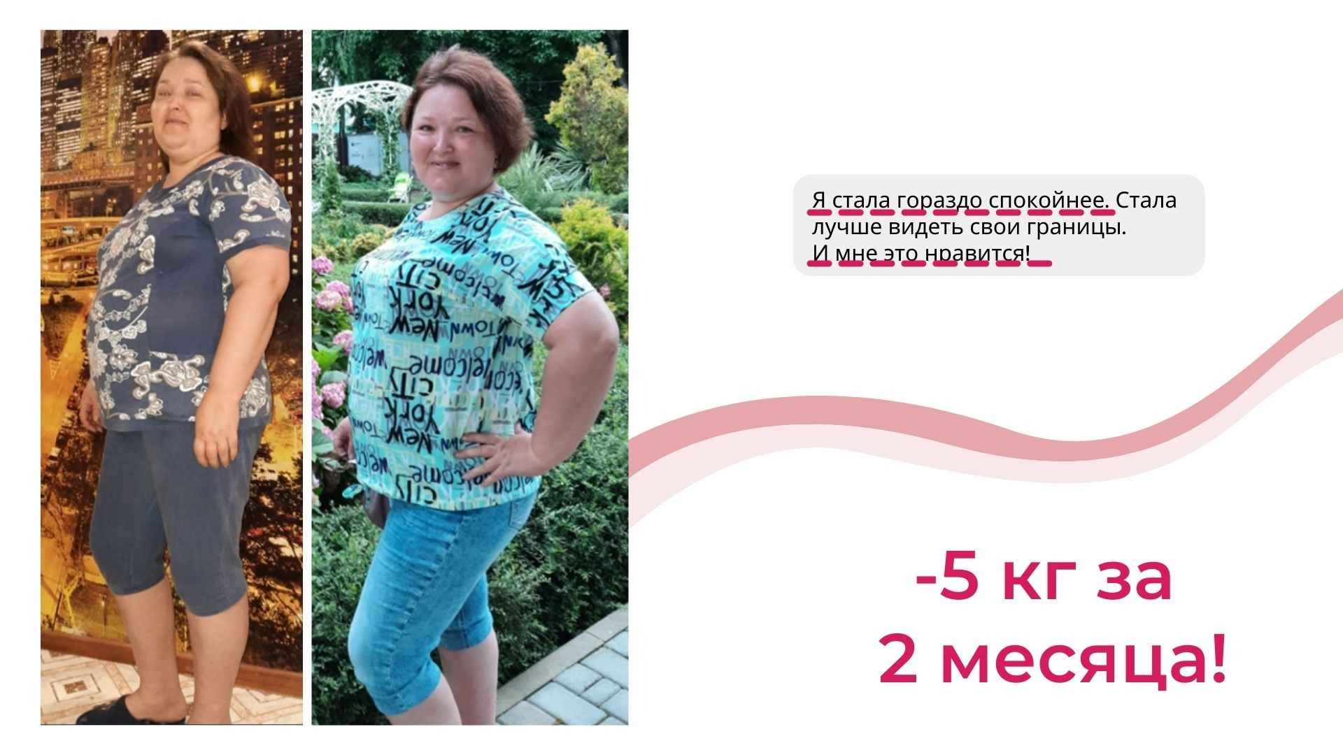 У меня не только более 6000 часов теории и практики в вопросах психологии лишнего веса, но и собственный результат от 115 до 67 кг, который держится более 8 лет.