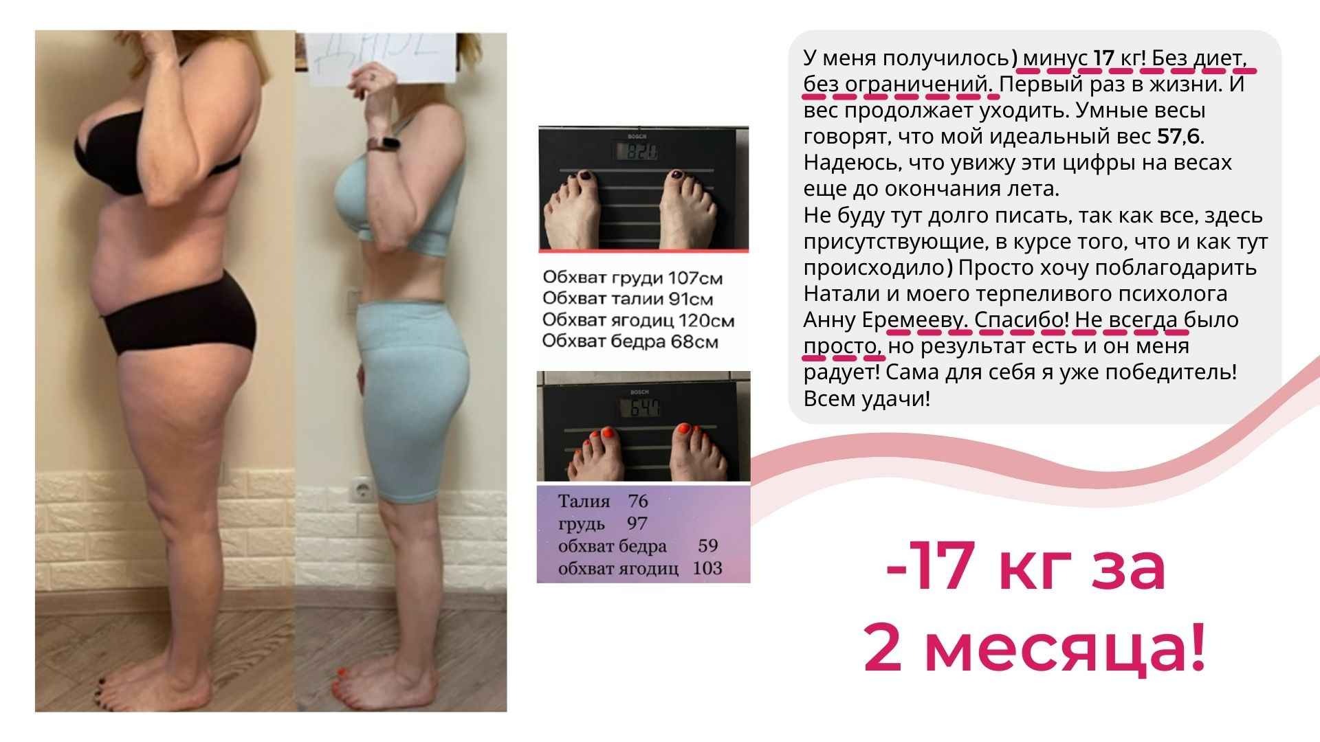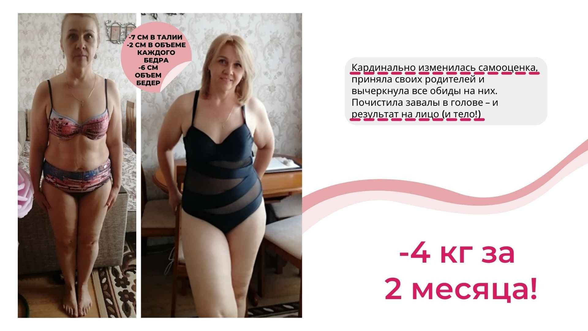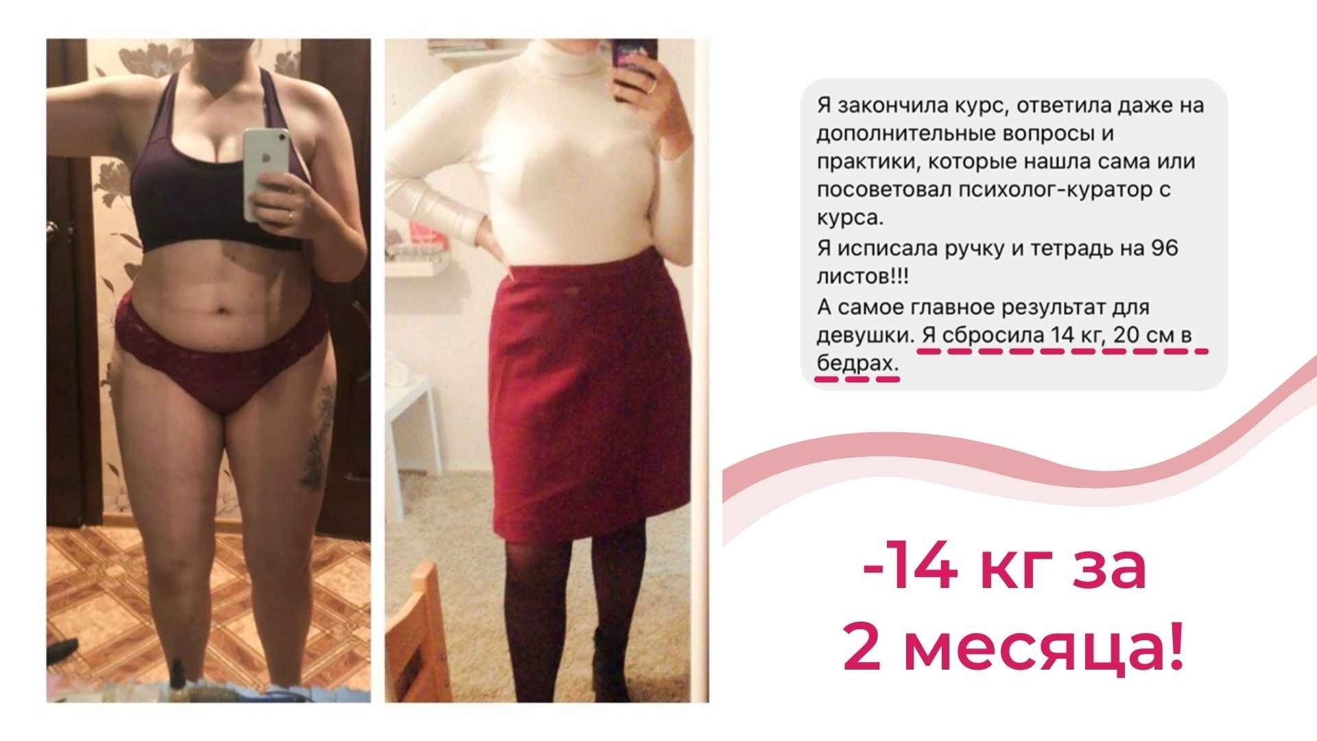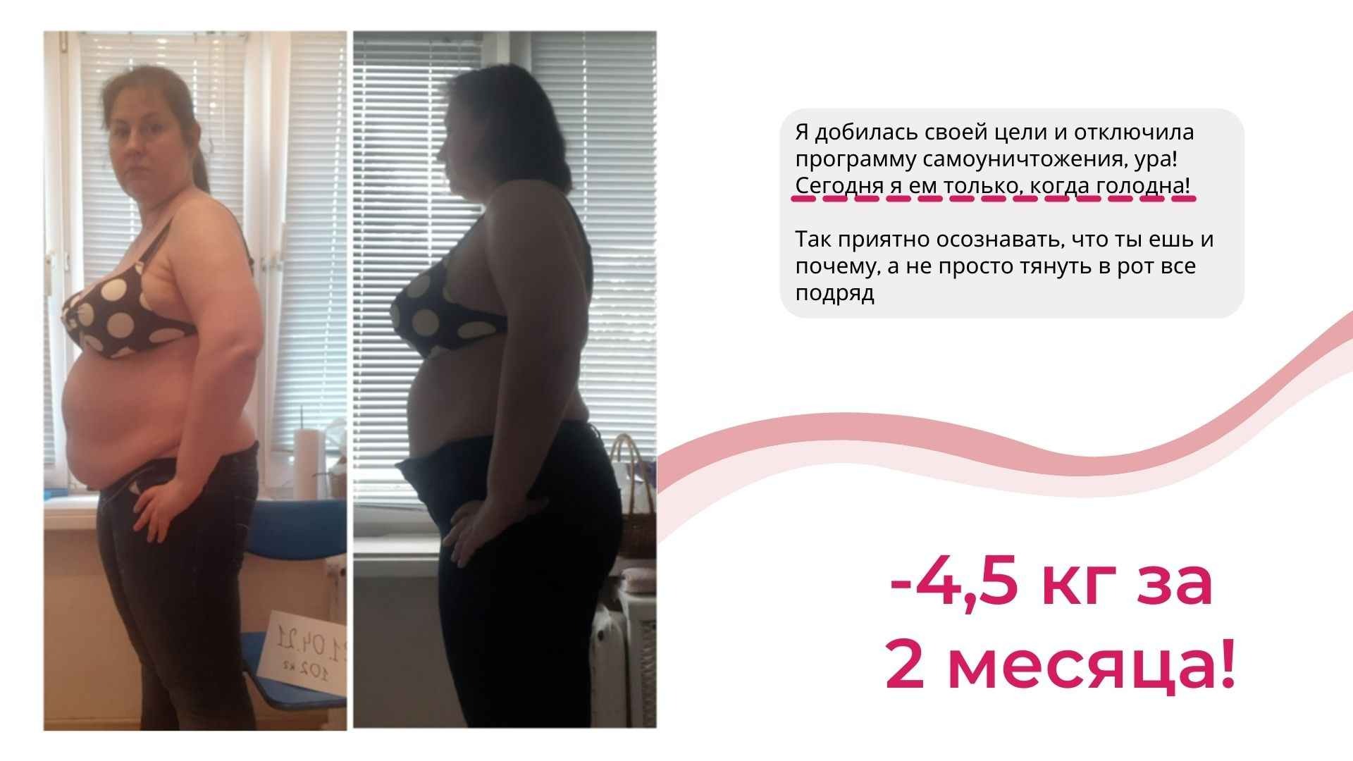 У меня не только более 6000 часов теории и практики в вопросах психологии лишнего веса, но и собственный результат от 115 до 67 кг, который держится более 8 лет.
