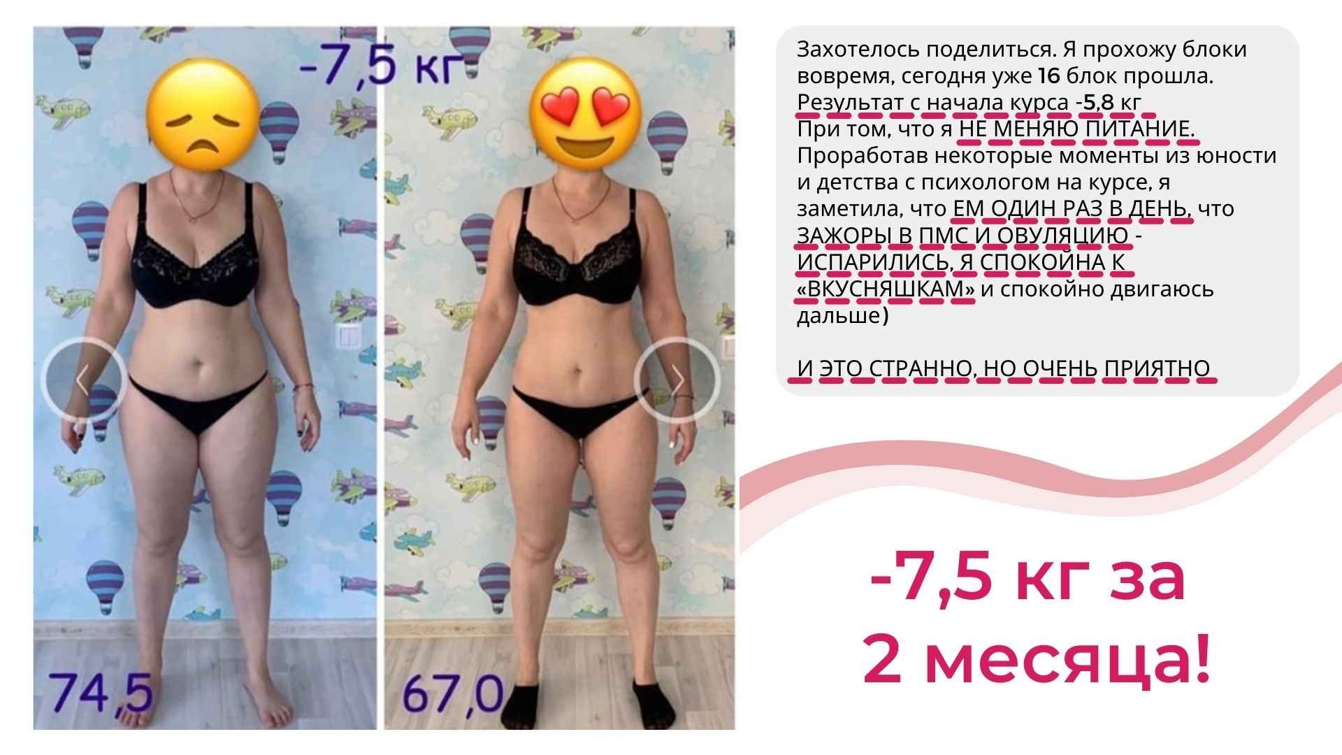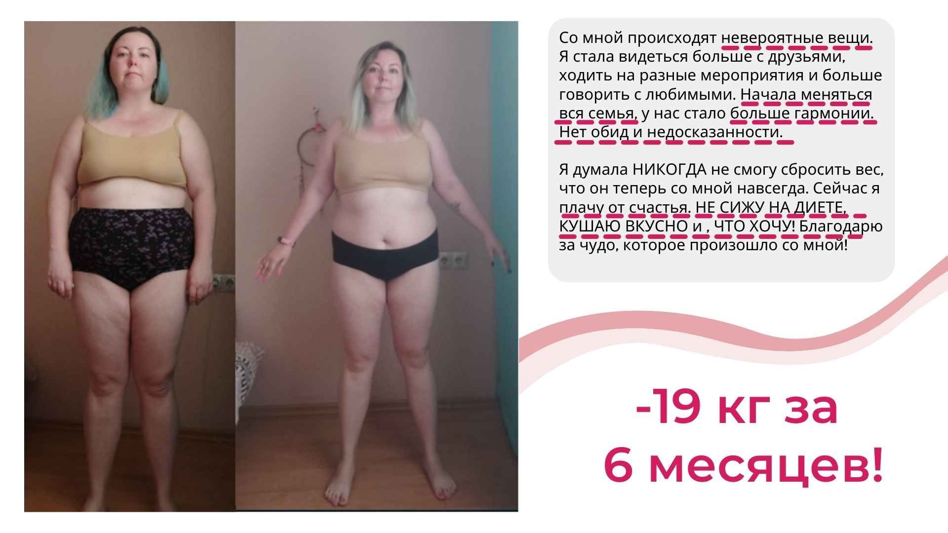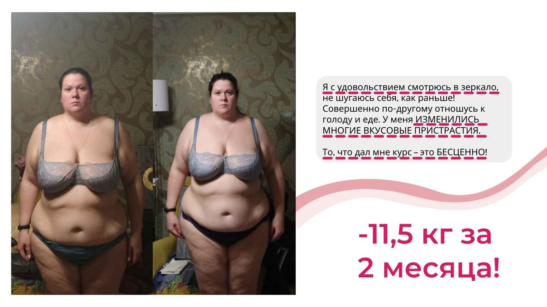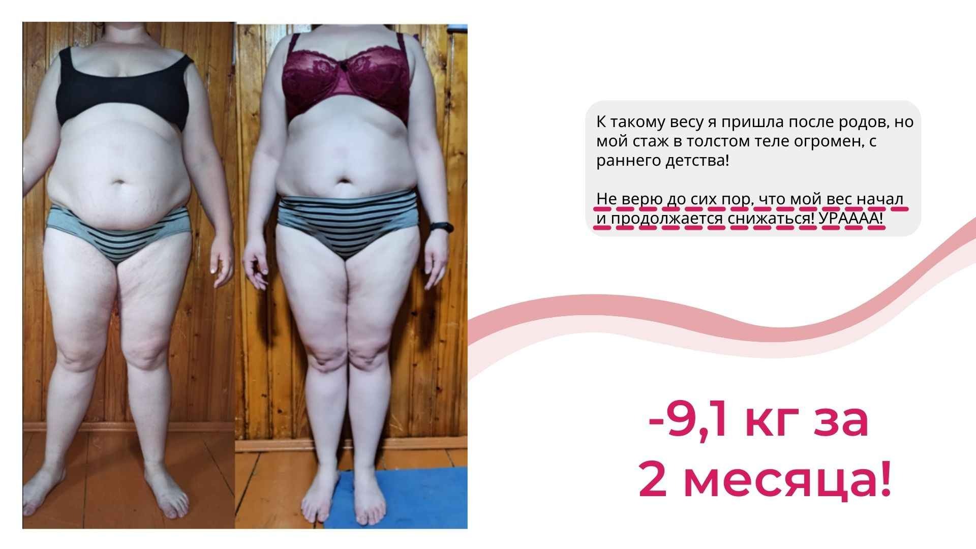У меня не только более 6000 часов теории и практики в вопросах психологии лишнего веса, но и собственный результат от 115 до 67 кг, который держится более 8 лет.
