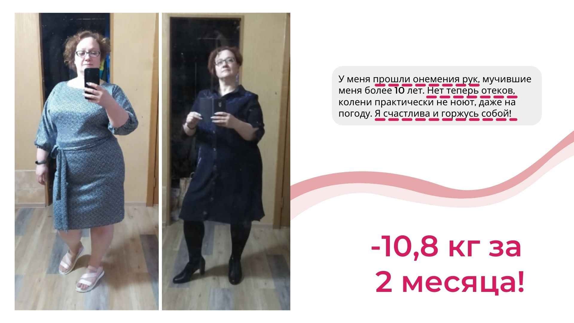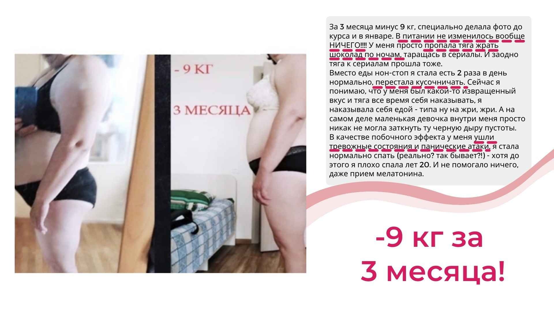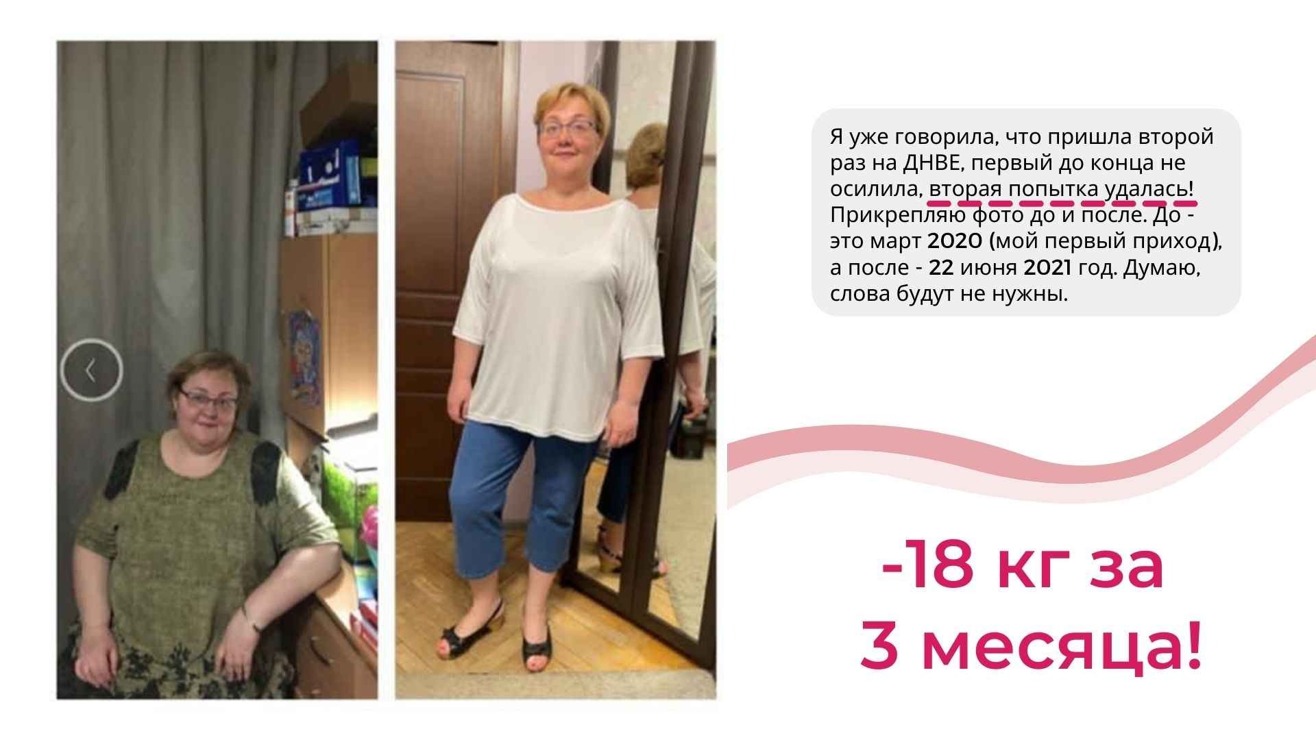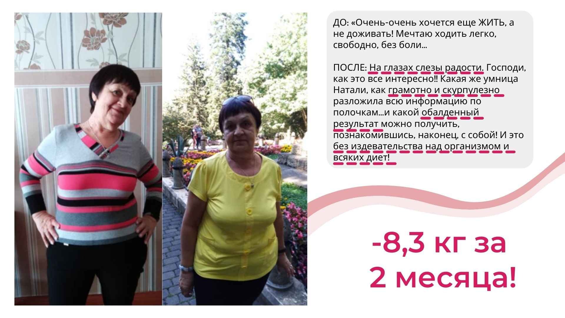 У меня не только более 6000 часов теории и практики в вопросах психологии лишнего веса, но и собственный результат от 115 до 67 кг, который держится более 8 лет.