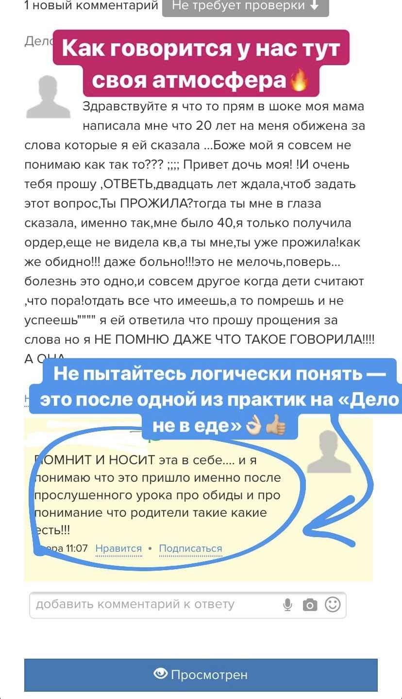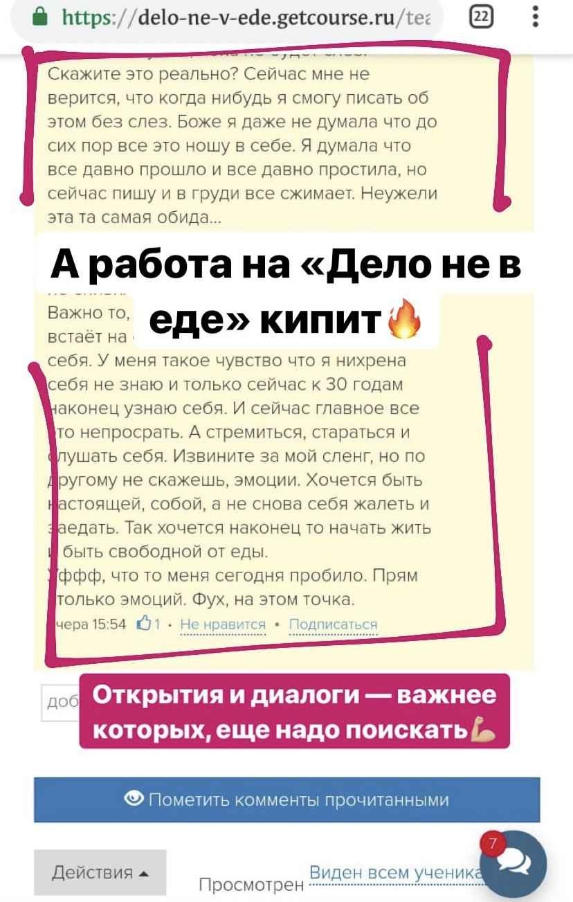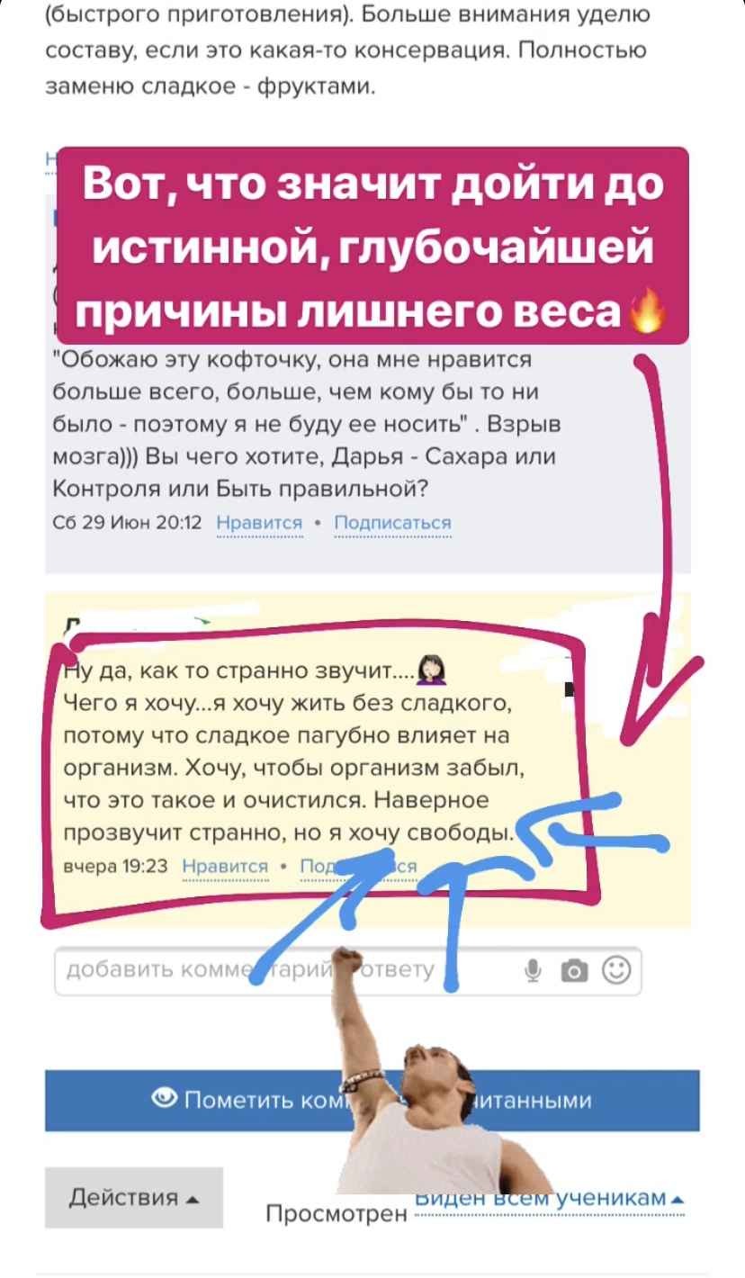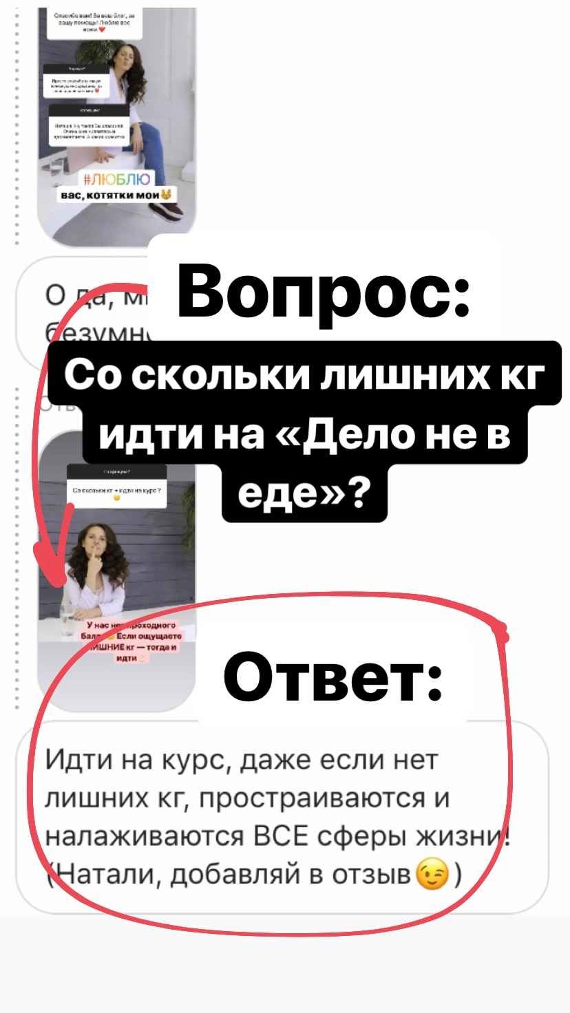 Дело не в еде — это не просто набор записанных видеоуроков. Это хорошо продуманная живая система, в рамках которой будут проходить живые онлайн-встречи с автором курса для разбора всех Ваших вопросов.
