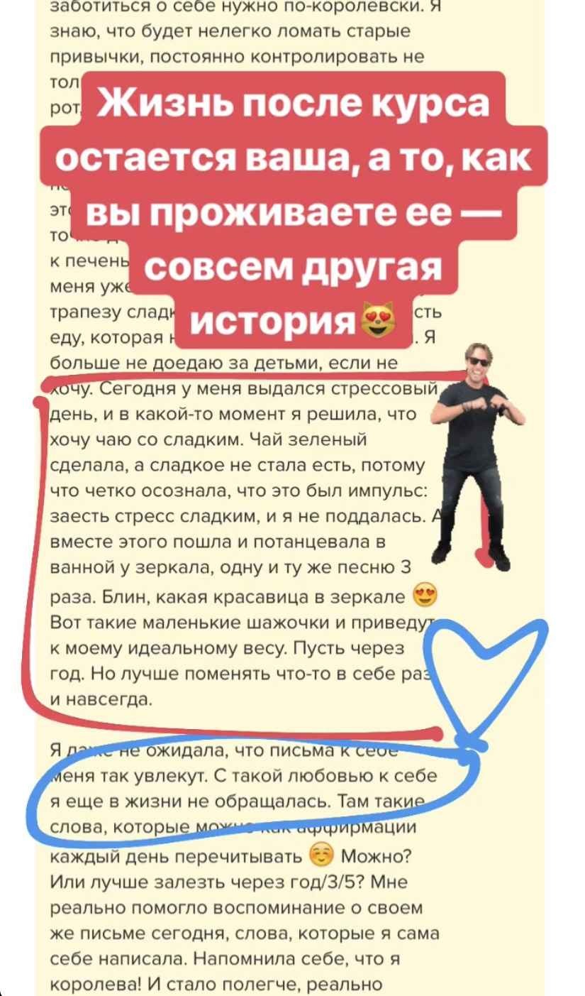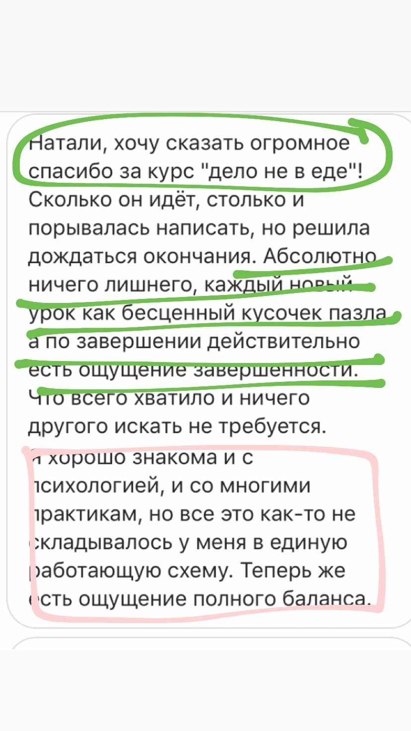При этом я не вываливаю на Вас тонну информации, которой обладаю. "Дело не в еде" — это не куча теории и упражнений, собранных по принципу «чем больше, тем лучше или что-нибудь да точно сработает». Это оптимально построенный курс, который позволит перейти Вам из точки А в желаемую точку Б.